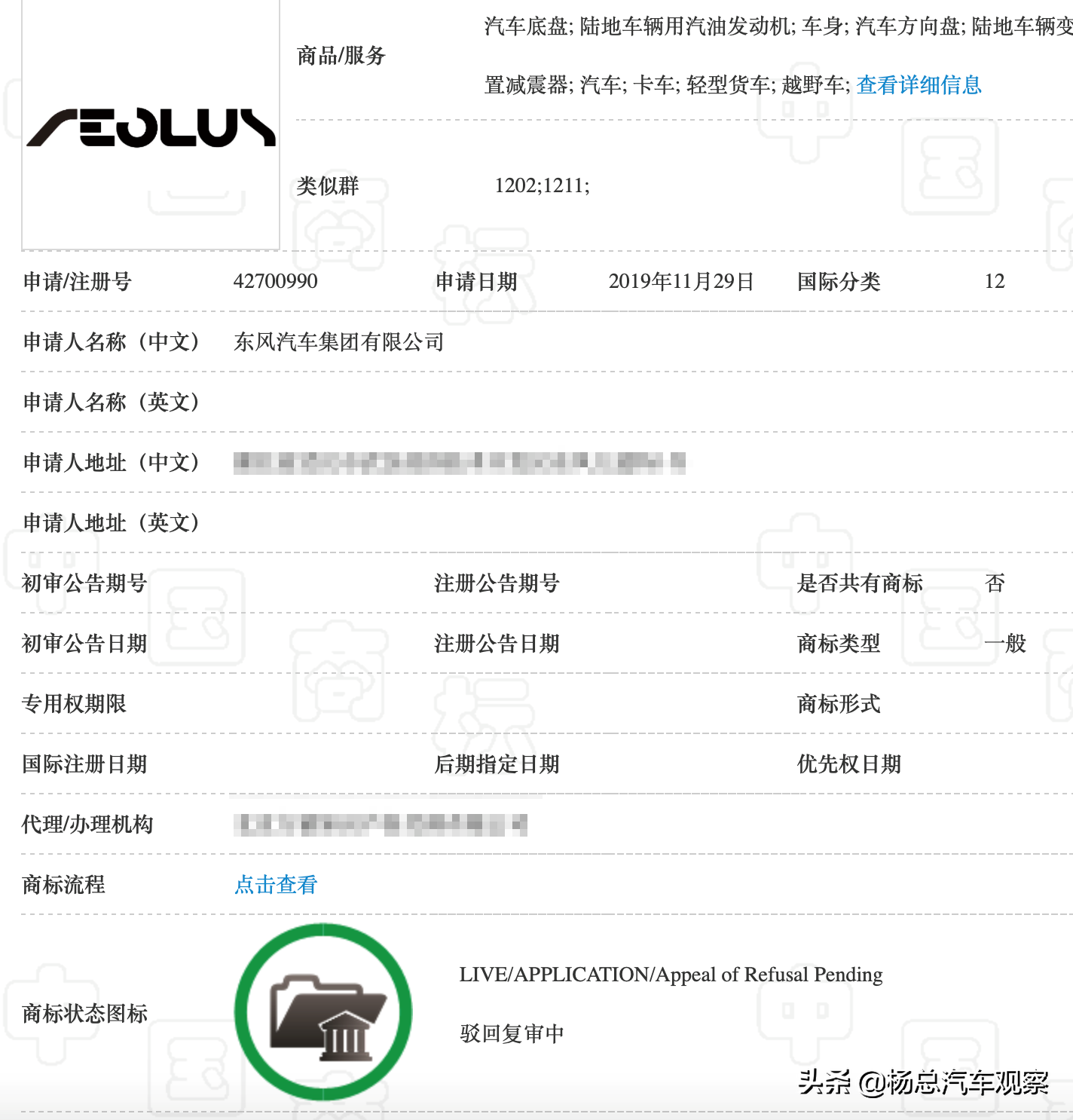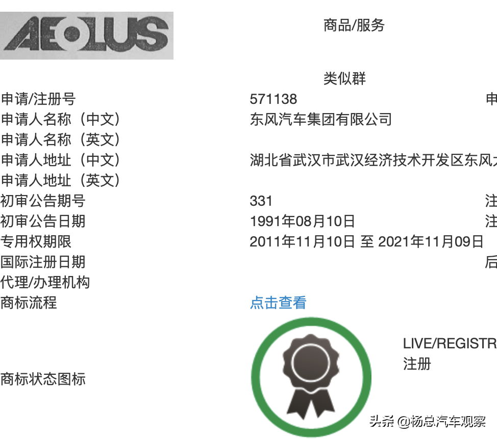 整体来说就是,AEOLUS早已被东风注册,这次只是艺术字的补充注册,而且只是“运载工具用悬置减震器”的部分驳回,“汽车”类别的使用申请已通过,可以使用。